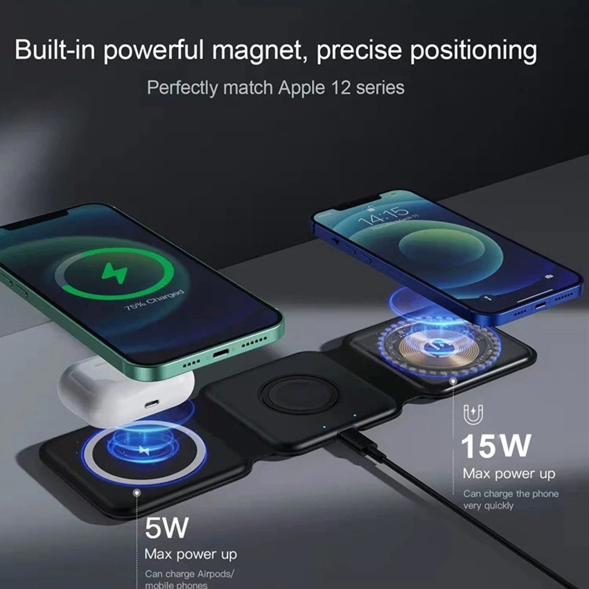 - About this project: 【3-in-1 Wireless Charging】 The 3-in-1 wireless charging station can charge your phone, Apple Watch and Airpods. Compatible with Apple AirPods 2/AirPods Pro and Apple Watch Series 8 7 6/5/4/3/2/SE. Supports hybrid charging between Apple and Android. 【30W Wireless Fast Charging】 This charging station is suitable for multiple devices Apple (for iPhone 14 13/13 Pro/13 Pro Max/12/12 Pro/12 Pro Max/11/11 Pro/11 Pro Max/XS/XR /XS MAX /X/8/8Plus, suitable for wireless charger standard mobile phones such as Samsung Galaxy S22/S21/S20/S10 /S9 /S8 /Plus/S7) that support 5W wireless charging. (Can charge mobile phones with wireless charging. Watch models only support Apple Watch) 【Adjustable and Portable Design】 Soft silicone makes the 180° folding smooth, the wireless charging pad turns into a phone holder in seconds. When charging, the phone is placed horizontally to watch movies and vertically to chat. The charging board is covered with a magnetic device, which will not slip off even if it is shaken. It can be used in office, home, dining table and bedroom. 【Qi Certification and Safety Multiple Protections】 The wireless charger is Qi certified, with intelligent protection technology, overvoltage protection, short circuit protection, overcurrent protection, etc. This foldable charger uses a professional magnetic shield, no radiation, and can be used by the elderly and children to protect the safety of you and your family. We recommend using the QC 2.0 / QC 3.0 Fast Charger Adapter for stable charging. Specification: * Wireless charging Standard: Qi * Support Charging power: 5W/7.5W/10W/15W /30W *Transmission Range: 5-8 mm *Wireless Power Conversion Rate: ≥80 *Interface: USB Type C What in the pacakge: 1*Wireless charger 1*Type C charging cable